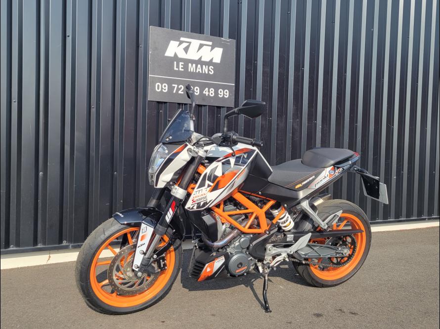 KTM 390 Duke 2014. Modèle compatible A2. Entretien des 15 000 kilomètres effectué (jeux aux soupapes, filtre à air, bougie, vidange + filtre, fluides + purge), pneu AV neuf, pneu AR récent. Aucun frais à prévoir.